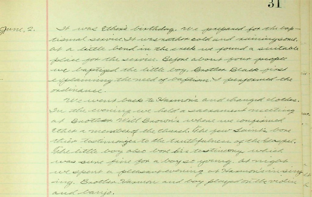 [Sunday] – 25 May 1902 Today is Sunday, decoration day. Today we went down to [the] cemetery with Bro[ther Joseph John Calvin (JC)] Garl[a]nd and family to where the people were gathered on the side of [a] hill, in under the trees. I was called on to speak to them, which I did. I spoke on the Resurrection of the Dead. It seemed to be interesting to all but one or two; they were Missionary Baptist[s]… Two speakers spoke, after they spoke in harmony with me and seem[ed] to partake of the Spirit, all went off enjoyable. [There were] about 150 present. We went back to Bro[ther Joseph John Calvin (JC)] Garl[a]nd’s, ate dinner, [and] held meeting at three o’clock. About 40 present. Elder [Othello] Roundy spoke a few minutes on Faith. I took up the remainder of the time on the Apostasy and Restoration and Zion Gathered to the Mountains. After [the] meeting, [we] baptized Sister [Mary Jane Davis] Harmon’s [and John Goulder Harmon’s] little boy, [Joseph Franklin Harmon]. The crowd stood on the banks of the stream. We sang “Lo on the Water’s Brink We Stand.” I dedicated the water and ourselves unto the Lord. Elder [Othello] Roundy baptized him. I confirmed him.
