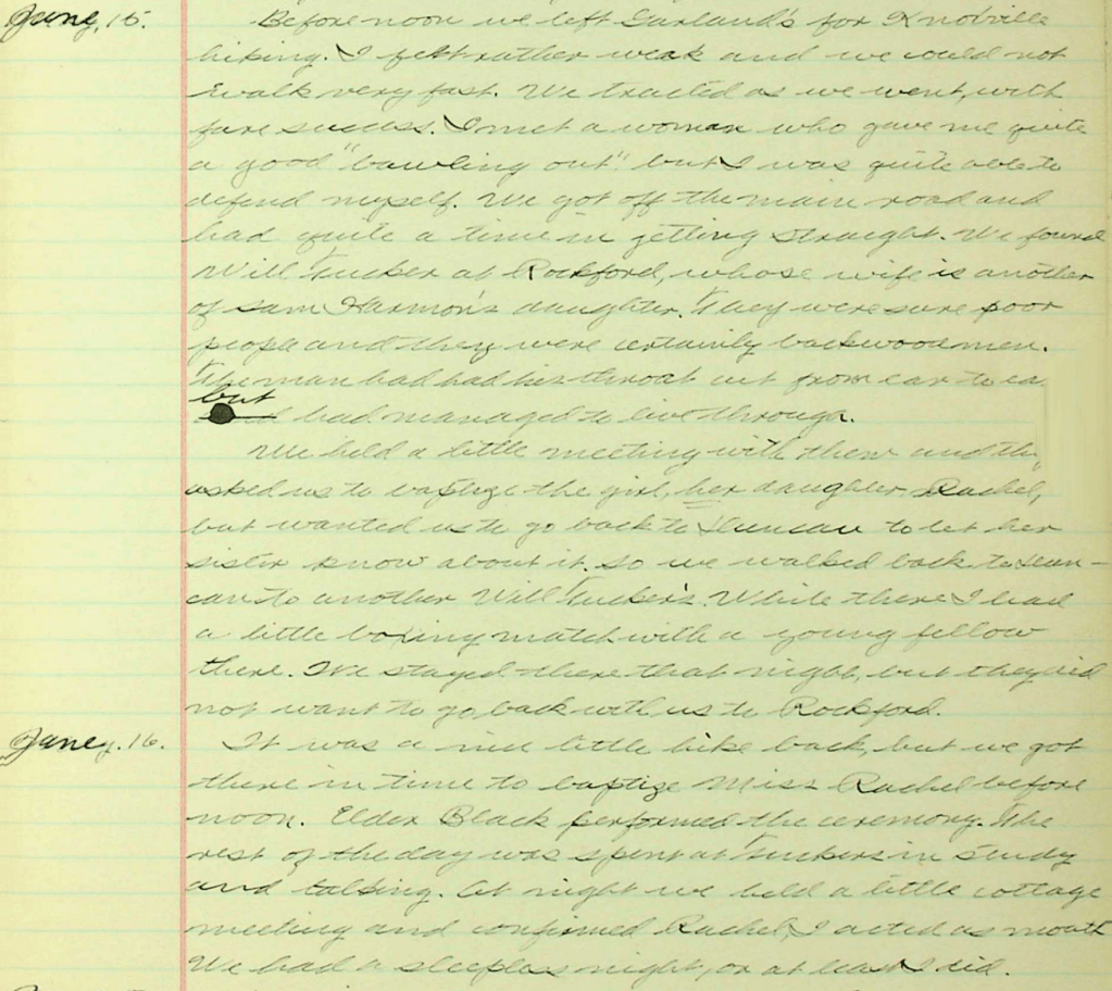 [Thursday] – 15 June [1922] Before noon we left [Joseph John Calvin (JC)] Garland’s for Knoxville hiking. I felt rather weak and we could not walk very fast. We tracted as we went with fare success. I met a woman who gave me quite a good “bawling out” but I was quite able to defend myself. We got off the main road and had quite a time in getting straight. We found Will[iam Edgar] Tucker at Rockford, whose wife, [Mary Jane Harmon], is another of Sam[uel Patterson] Harmon’s daughter[s]. They were sure poor people and they were certainly backwoodmen. The man had had his throat cut from ear to ear but had managed to live through. We held a little meeting with them and they usked us to baptized the girl, her daughter Rachel [Emeline Tucker], but wanted us to go back to [illegible] to let her sister know about it, so we walked back to [illegible] to another Will Tucker’s (sic). While there, I had a little boxing match with a young fellow there. We stayed there that night but they did not want to go back with us to Rockford.