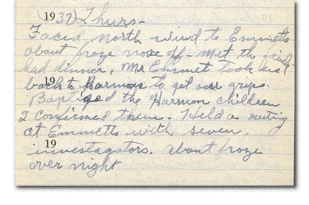 Thurs[day] – 11 February 1937 Faced north wind to [William Russell] Emmet[t]’s. About froze nose off. Met the family. Had dinner. Mr. Emmet[t] took us back to get our grips [bags]. Baptized the Harmon children [Alberta Harmon and Nole Toliver Harmon] and confirmed them. Held a meeting at [William Russell] Emmett’s with seven investigators. About froze overnight.