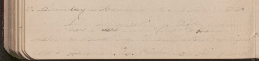 Sunday – 23 August 1896 [illegible] held a meeting after which some other elders went up to Harmons, held a meeting. Elder [William Henry] Carter baptized [Mary Jane Davis] Harmon [illegible] [Elder Archibald Squire] Richardson being sick.