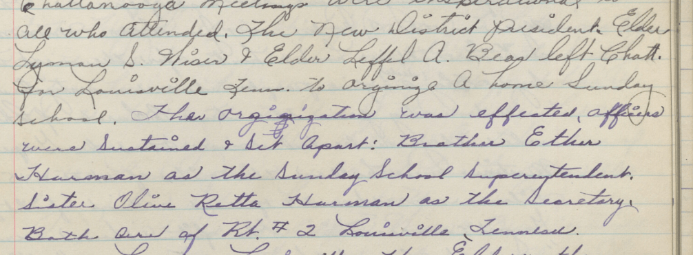 “…The new District President, Elder Lyman S[mith] Wiser and Elder Leffel A[ddison] Bean left Chatt[anooga] for Louisville, Tenn[essee] to organize a Home Sunday School. The organization was effected, officers were sustained and set apart: Brother Ether [Lloyd] Harmon as the Sunday School Superintendent, Sister Olive Retta Harmon as the Secretary. Both are of R[ou]t[e] #2 Louisville, Tennessee“