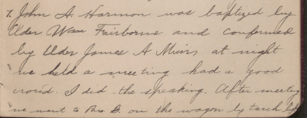 [Monday] – 7 September 1896 John G[oulder Monroe] Harmon was baptized by Elder W[illia]m Fairbourn and confirmed by Elder James A[lma] Muir. At night we held a meeting, had a good crowd. I did the speaking. After [the] meeting, we went to Bro[ther Joseph John Calvin (JC)] G[arland‘s] on the wagon by torch light.