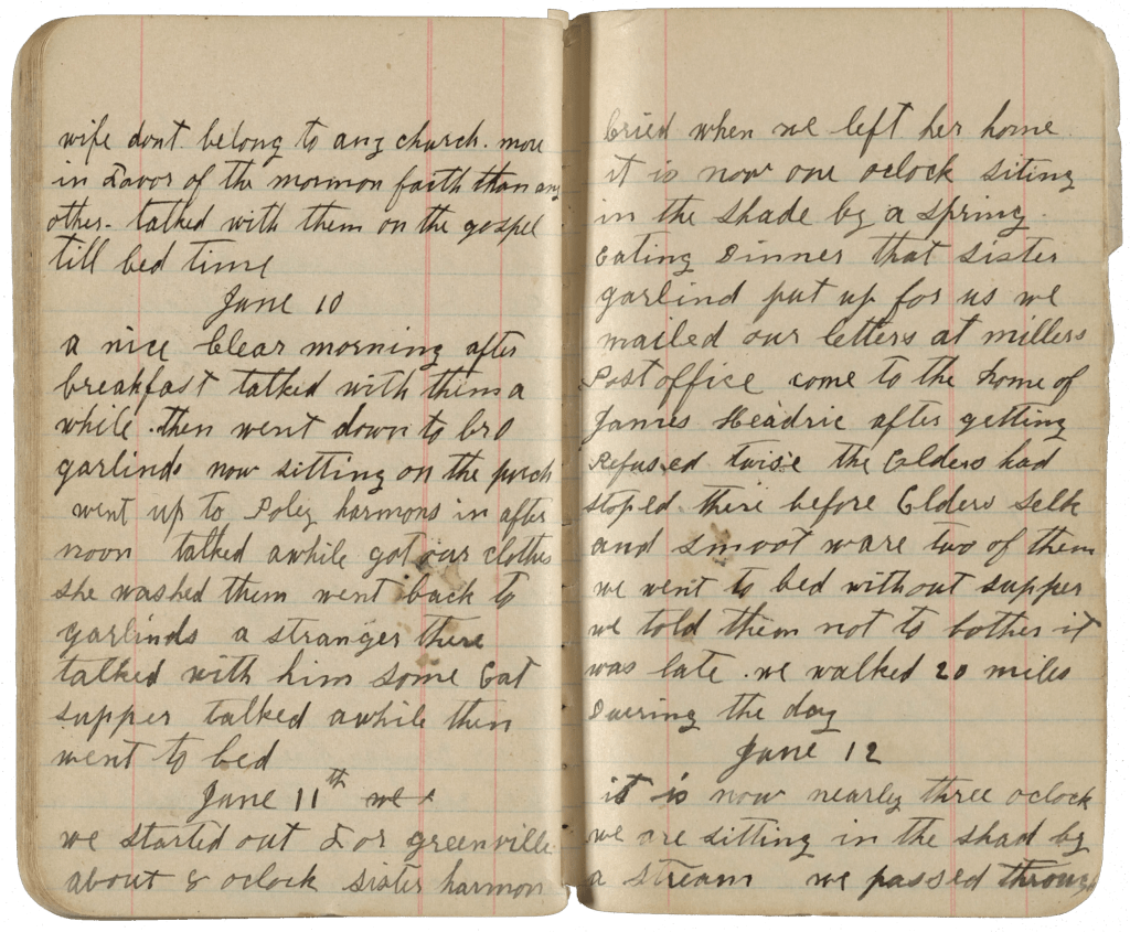[Wednesday] – 11 June 1902 We started out for Greenville about 8 o’clock. Sister [Polly Ann Davis] Harmon cried when we left her home. It is now one o’clock, sitting in the shade by a spring eating dinner that Sister [Sarah Margaret Cauble] Garl[a]nd put up for us. We mailed our letters at Millers Post Office. Came to the home of James Headric after getting refused twice. The Elders had stopped there before. Elders Selk and Smoot were two of them. We went to bed without supper. We told them not to bother. It was late. We walked 20 miles during the day.
