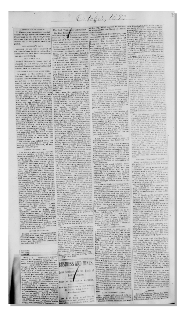 [The East Tennessee conference was held Saturday and Sunday, September 16th and 17th, in Sweetwater, seven miles east of Newport, Cook County. There were present, Elder J. Golden Kimball, mission president, with clerk, George A[lma] Smith from the office of Chattanooga, Elders Thomas W[atts] Sloan, (conference president), Andrew D. Helm, Jed[ediah] G[rant] Shumway, Robert C[unningham] Young, L[orenzo] W[esley] Roundy, Leo T[homas] Shelley, Joseph C[ross] Orme, Thomas Hicken, J[ohn] H[yrum] Hubbard and William L[ehi] Hayes. The weather was extremely pleasant, and nature did all within her power to make the affair succesful. The autumn sun wore a benign smile, and the mountains were decked in their bluest tints—all nature smiled. A numerous host of friends sprang up spontaneously and offered to entertain either Elders or visiting friends, so all were amply provided for. This was one of those pleasant and soothing occasions in missionary life which can only be appreciated by those who have participated in like reunions.]