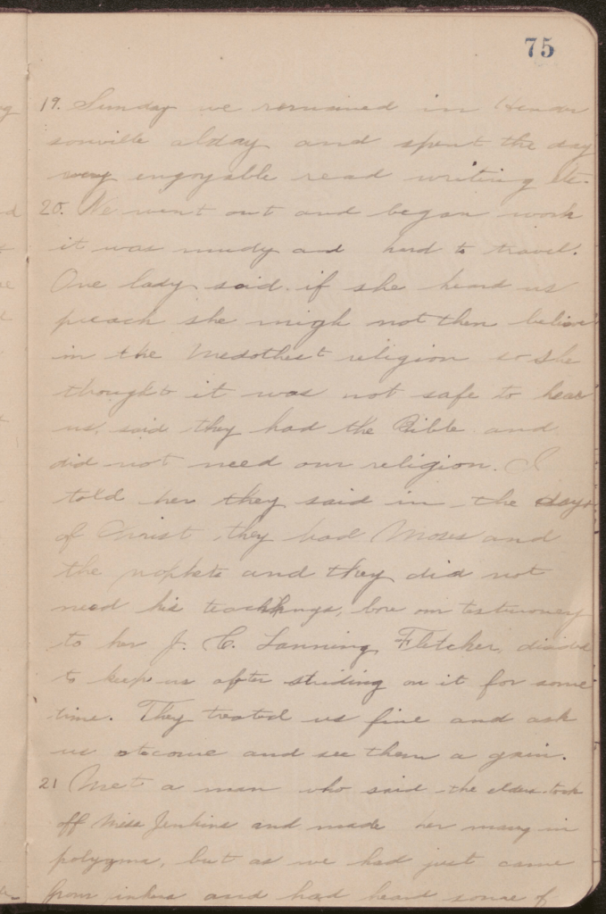 Sunday – 22 September 1895 Elder [Hans Walter] Christensen and I went to [a] Baptist Church. In the evening, we went to the Southern Medithist (sic), where we hear[d] the best sing[ing] I have heard in the Southern States by a lady.
