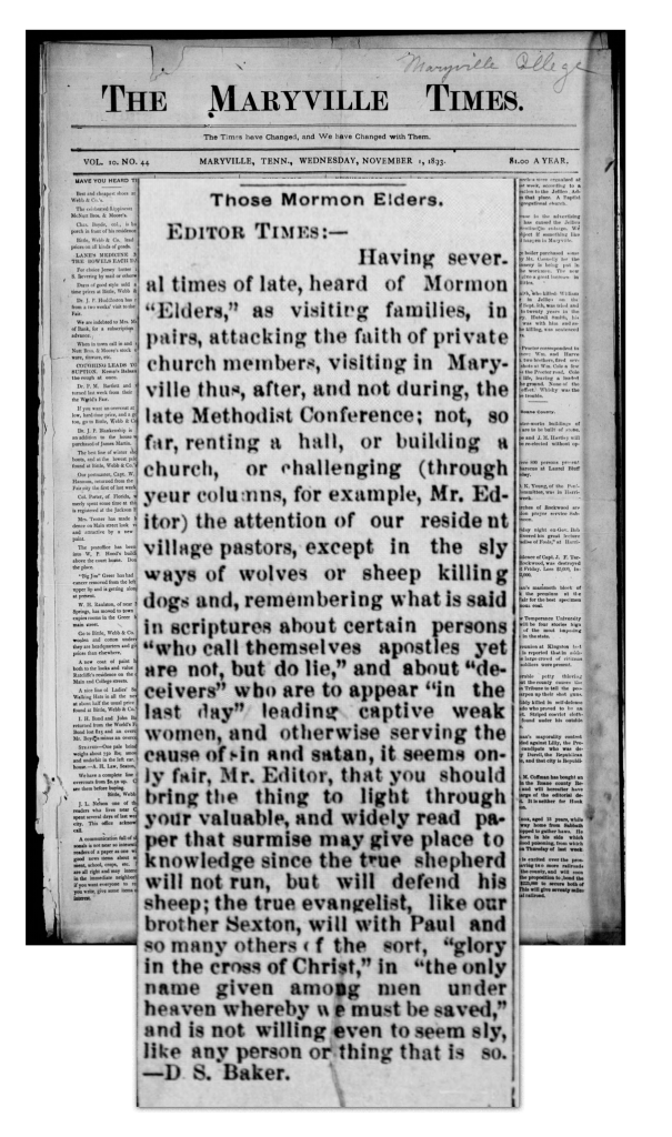 This “anti-Mormon” sentiment abounded for years in the press. When the elders shared the message of the gospel, Blount County residents had already read biased press releases and stories mocking the “Mormons” over polygamy, Mountain Meadows, the “golden Bible,” and much more. The Maryville Times headlined, “The Mormon Delusion,” “The Mormon Infamy,” “The White Caps are after the Mormons,” and more. The Maryville Times would echo the sentiment felt within communities where violence occurred. Dozens of articles in the Maryville Times during this period seemingly justify the violence against missionaries, cheering each time the elders are chased out of a county. This fueled the local religious community to stand against the doctrine of “Mormonism” and consider taking action against the missionaries. Threats against the elders and those who hosted them were not uncommon before and after the turn of the century.